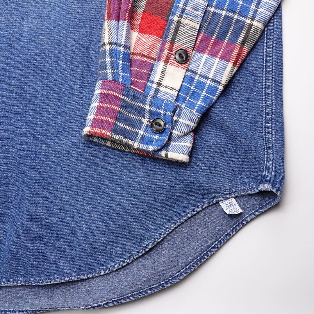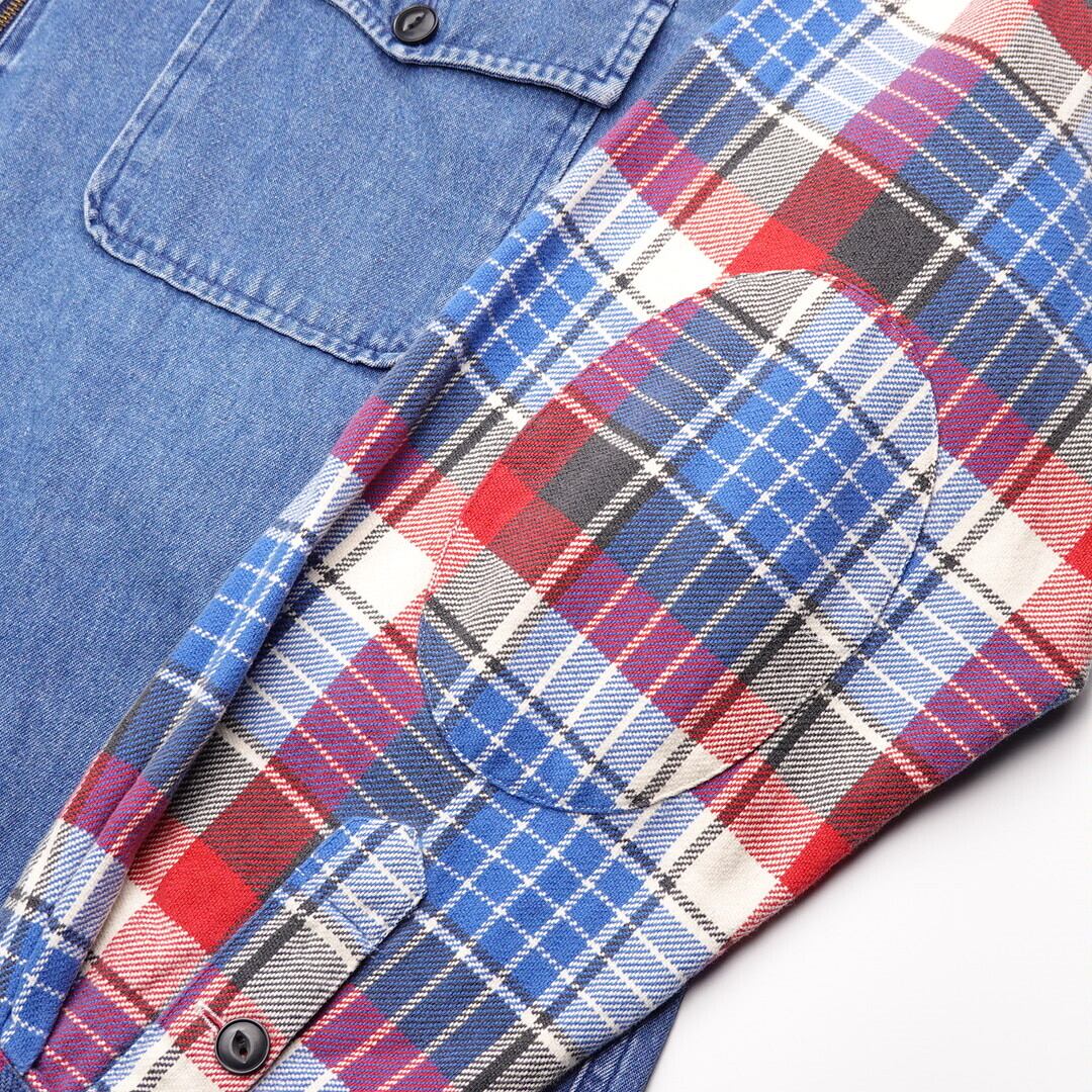 チンストラップや猫目ボタン・エルボーパッチ等のビンテージディテールにデニムとネルの切替を合わせるところがpoloらしい一着。